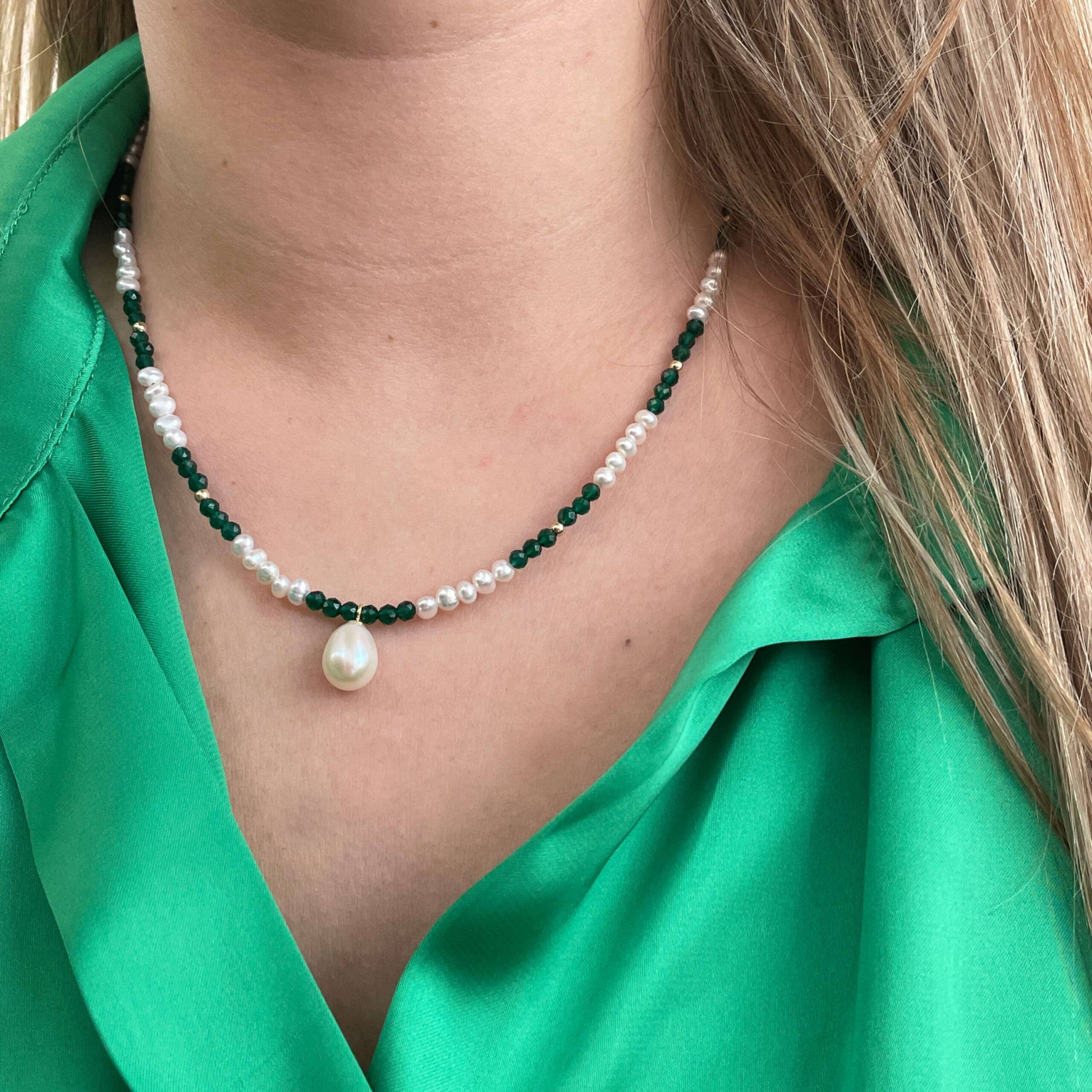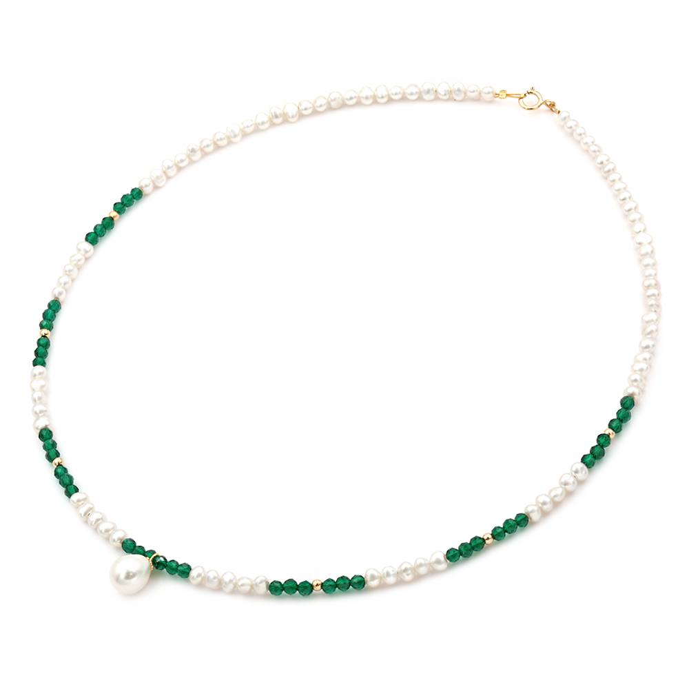 Κολιέ με λευκά μαργαριτάρια γλυκού νερού Fresh Water Pearl διαμέτρου 3,0 – 3,5 χιλιοστών σε σχήμα Round (στρόγγυλο) ποιότητας ΑΑΑ και πράσινο Quartz πολυεδρικής κοπής.