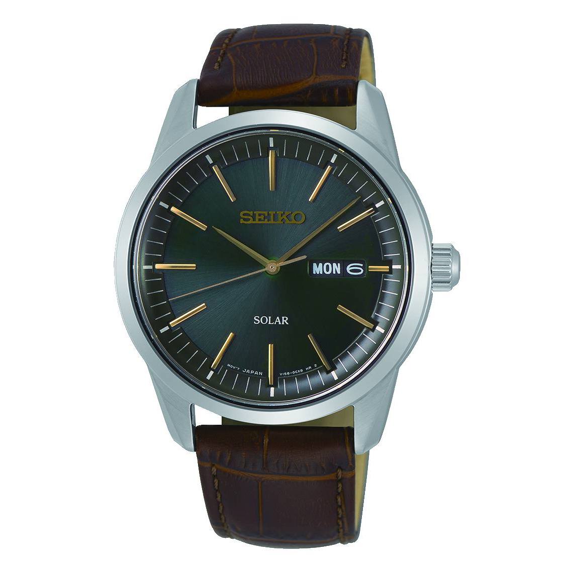 A watch from the & nbsp; Solar & nbsp; series of & nbsp; Seiko , with sapphire crystal, metallic details and metal indicators.