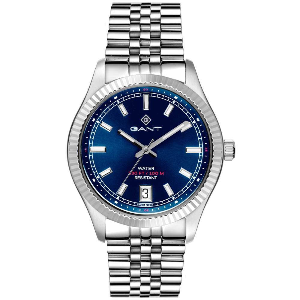 Ένα ρολόι της Gant από τη σειρά Eastham, με ατσάλινη ανοξείδωτη κάσα 48 mm και ατσάλινο μπρασελέ. Το μπλέ καντράν έχει μεταλλικές λεπτομέρειες και δείχτες με φώσφορο και ο μηχανισμός του διαθέτει ένδειξη ημερομηνίας με παράθυρο στη θέση 3.