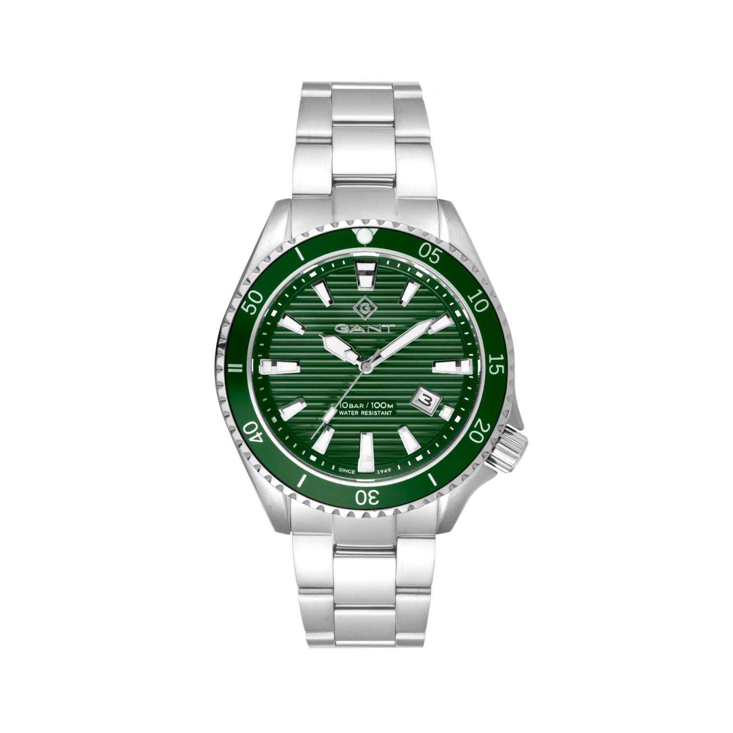 Ένα ρολόι της Gant από τη σειρά Waterville, με ατσάλινη ανοξείδωτη κάσα 45mm και ατσάλινο μπρασελέ. Το πράσινο καντράν έχει μεταλλικές λεπτομέρειες και δείχτες και ο μηχανισμός του διαθέτει ένδειξη ημερομηνίας με παράθυρο στη θέση 4.