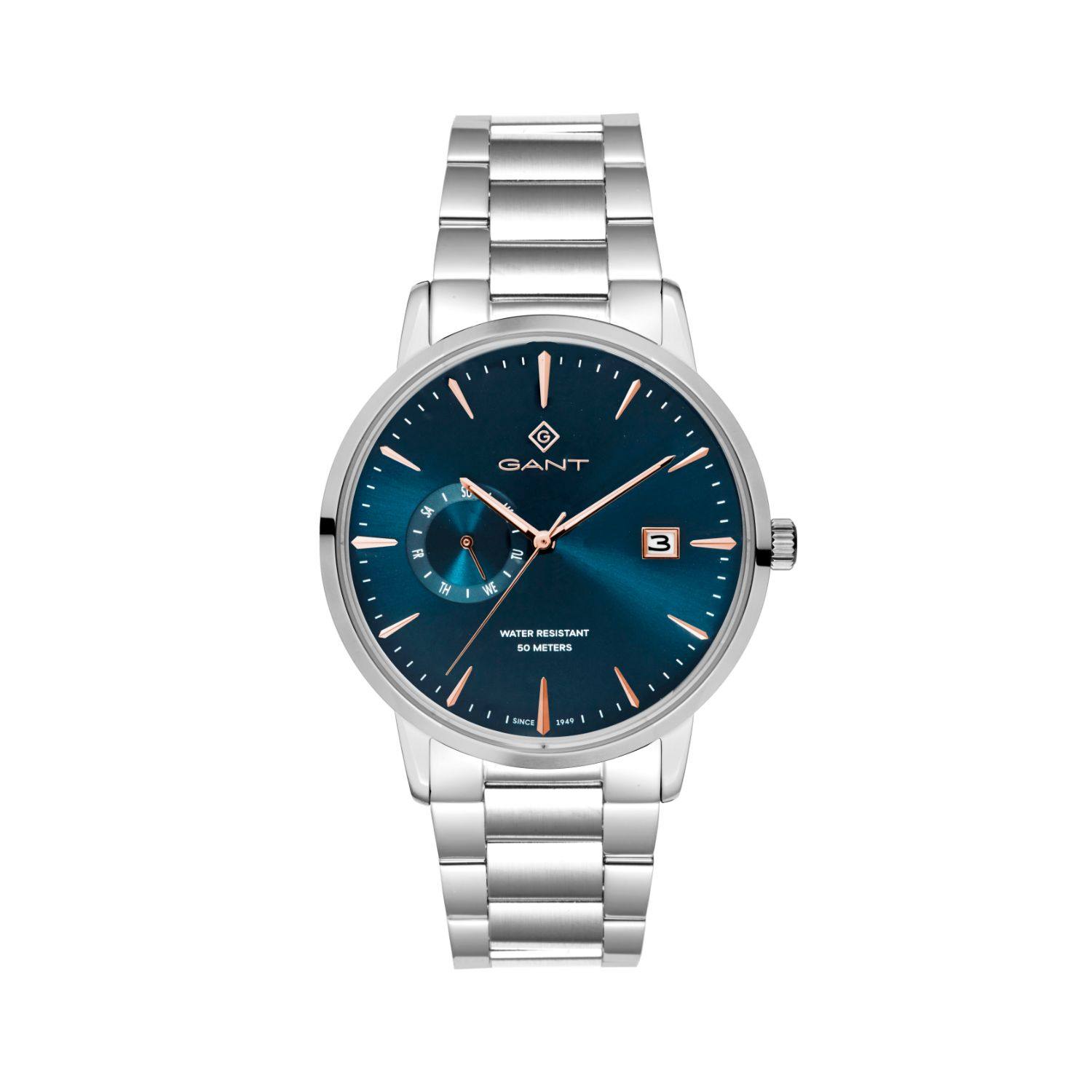 Ένα ρολόι της Gant από τη σειρά East Hill, με ατσάλινη ανοξείδωτη κάσα 43 mm και ατσάλινο μπρασελέ. Το καντράν έχει μεταλλικές λεπτομέρειες και δείχτες και ο μηχανισμός του διαθέτει: Ένδειξη ημερομηνίας με παράθυρο στη θέση 3 Ένδειξη ημέρας με δείχτη στη θέση 9