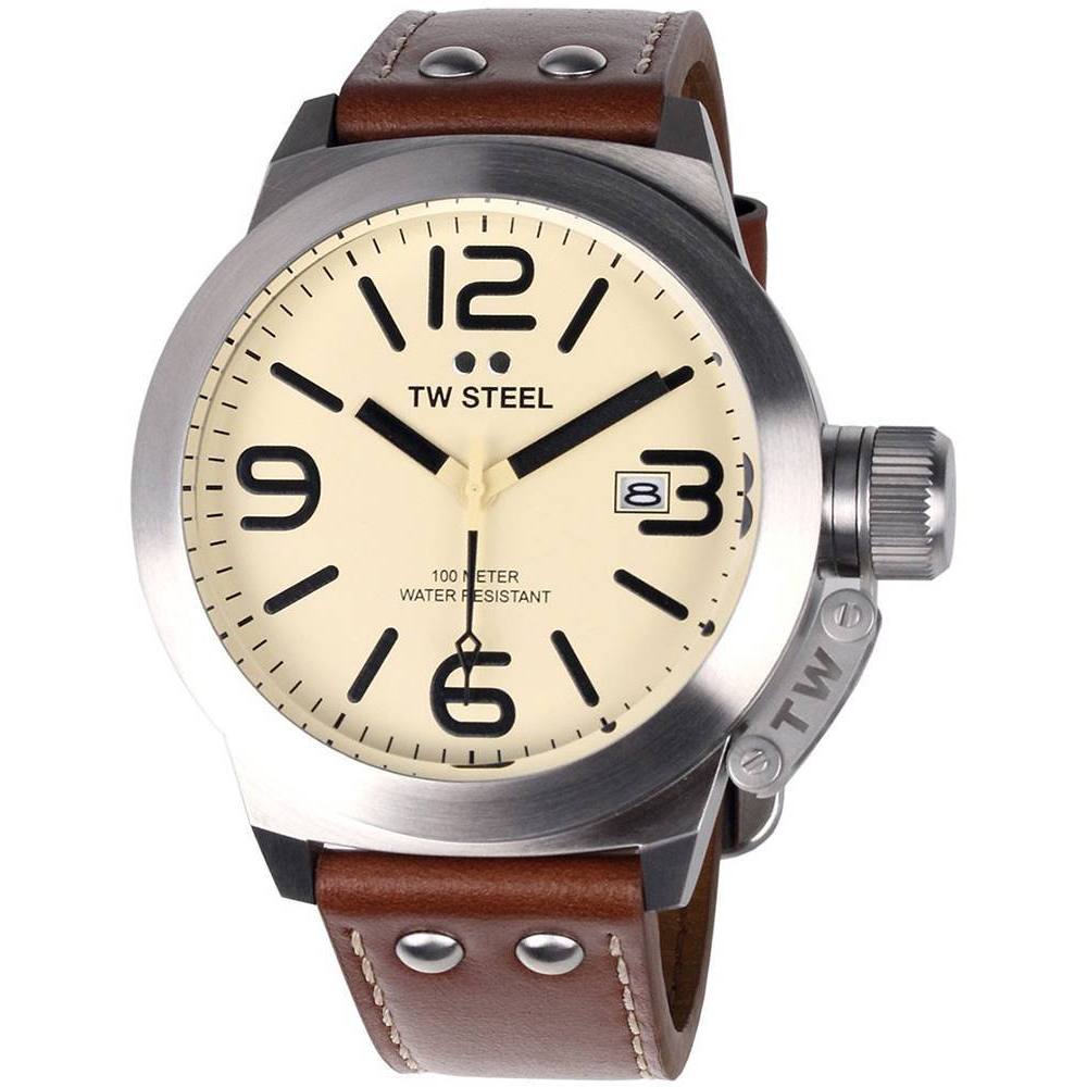 The TW-Steel cs12, has a brown leather strap with brown dial and fluorescent indicators and indicators.