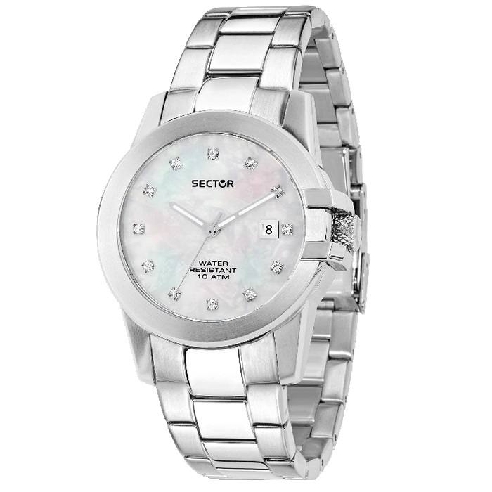Ρολόι γυναικείο Sector αδιάβροχο στα 100μ ,με μπρασελέ σε ασημί χρώμα. Λευκό φιλντισένιο καντράν διακοσμημένο με ζιργκόν με ασημί δείκτες και στοιχεία. Ένδειξη ημερομηνίας