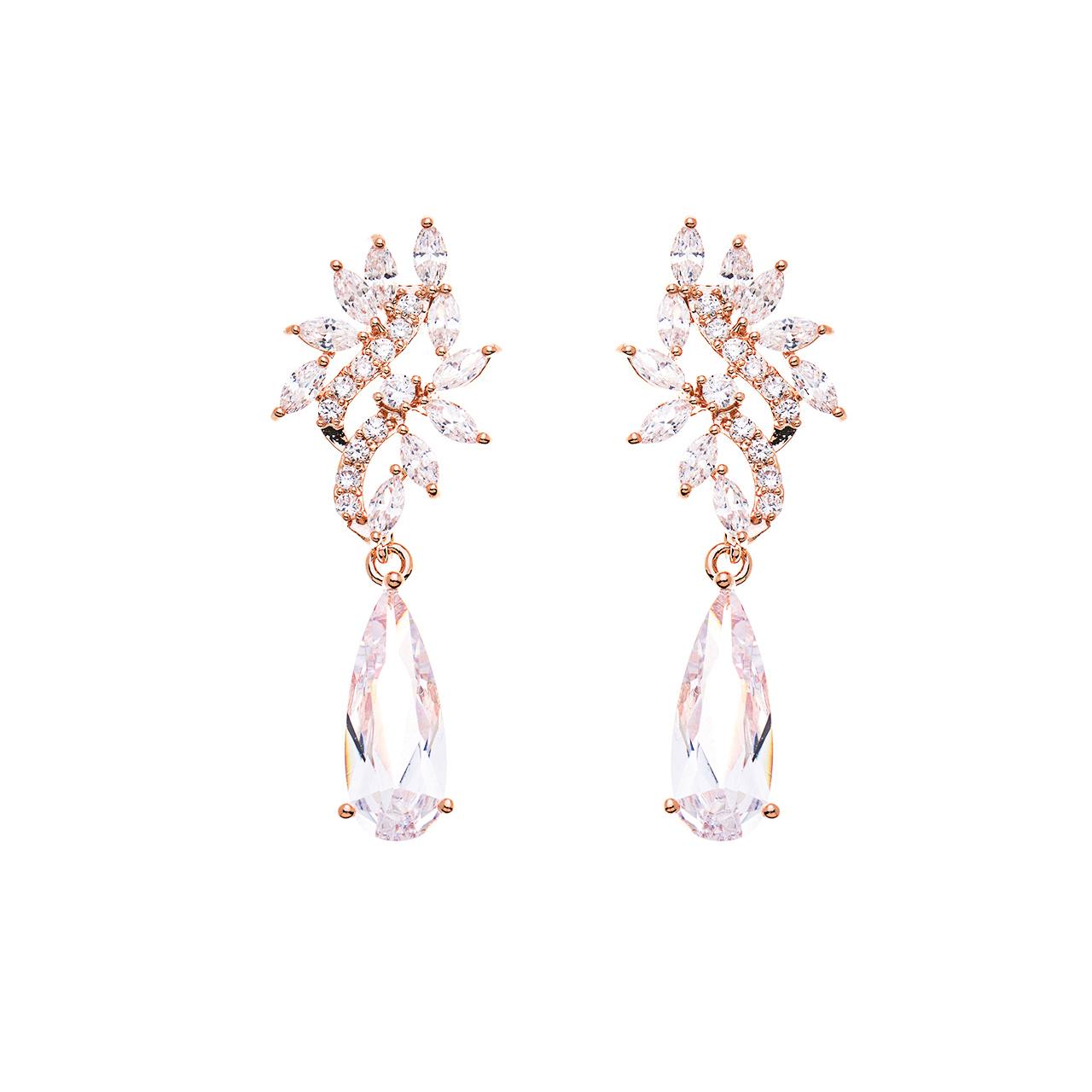 Σκουλαρίκια κρεμαστά Gloria Hope, από ορείχαλκο σε ροζ χρυσό χρώμα με λευκές πέτρες ζιργκόν Swarovski. Iδανικό αξεσουάρ για τη νύφη.