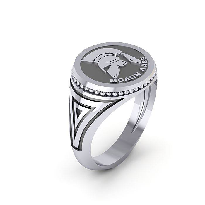 Ανδρικό και γυναικείο Δαχτυλίδι σε στρόγγυλη φόρμα με ένθετη την ιστορική φράση ΜΟΛΩΝ ΛΑΒΕ εμπνευσμένο από αρχαία Ελληνικά Θέματα από τη Συλλογή μας Πατριωτικά Κοσμήματα που μπορεί να φορεθεί στο παράμεσο δάχτυλο, ή στο τελευταίο - μικρό ως chevalier