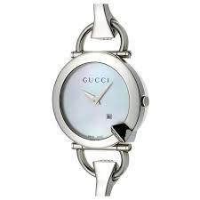 Ένα υπέροχο γυναικείο ρολόι Gucci με λευκό καντράν και ασημί ατσάλινο μπρασελέ.