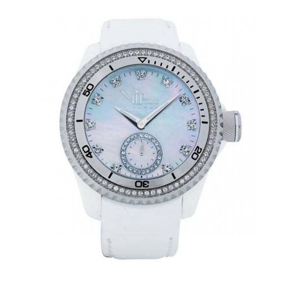 Ενα ξεχωριστό ρολόι με καντράν από λευκό φίλντισι και περιμετρικά της κάσας κρύσταλλα swarovski ,με λευκό λουράκι απο τη σειρά MAGNUM COLLECTION της VIP.